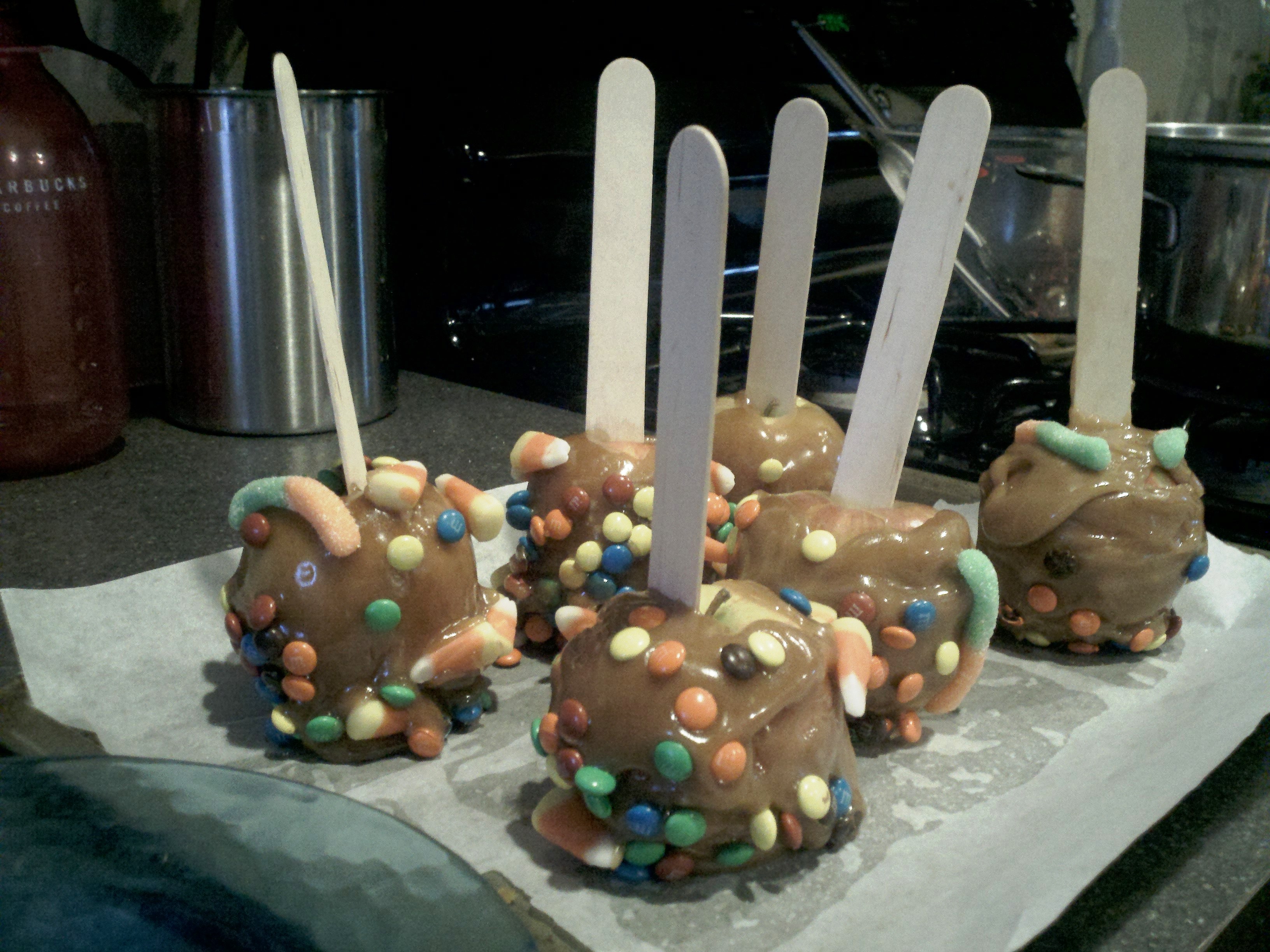 Combine all ingredients except apples and nuts in 2-quart saucepan. Cook over medium-high heat to 265°F; stir constantly. If you don’t have a candy thermometer, boil the mixture until it looks thick enough to coat the apples – not too runny or too thick. Remove from heat. Cool 5 minutes. Holding apple by stick, roll in hot honey mixture to coat; roll bottom of apple in nuts if desired. We rolled our apples in mini M&M’s, candy corn and gummy worms – what a combo! Place the apples on waxed paper squares to cool. Repeat with remaining apples. Makes 6 apples.