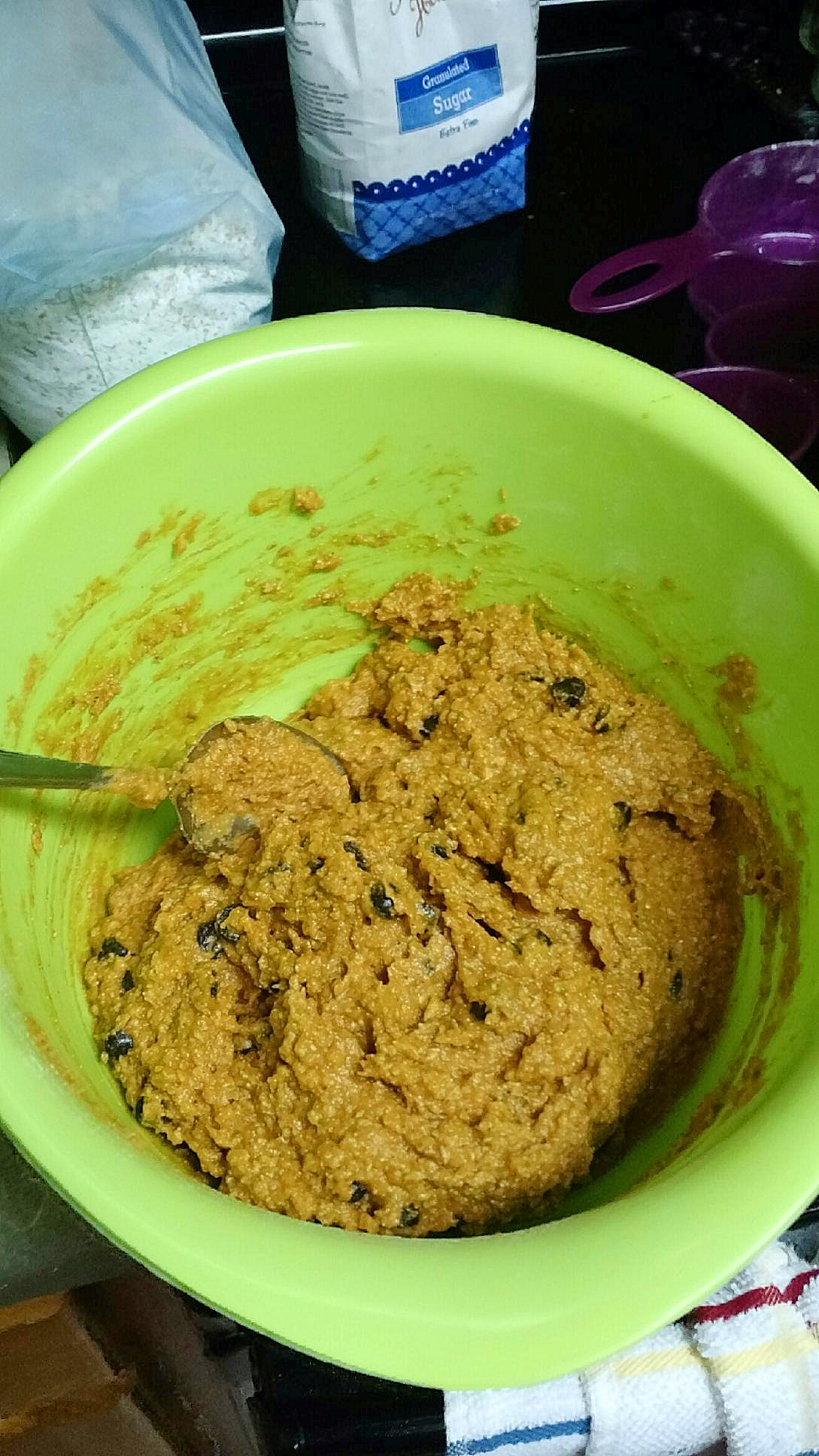 Mix the dry ingredients in one large bowl and the wet ingredients in a smaller bowl. If using chips and nuts, add them to the wet mixture and blend thoroughly to evenly-distribute them. Pour the wet ingredients into the dry ingredient bowl and mix thoroughly.