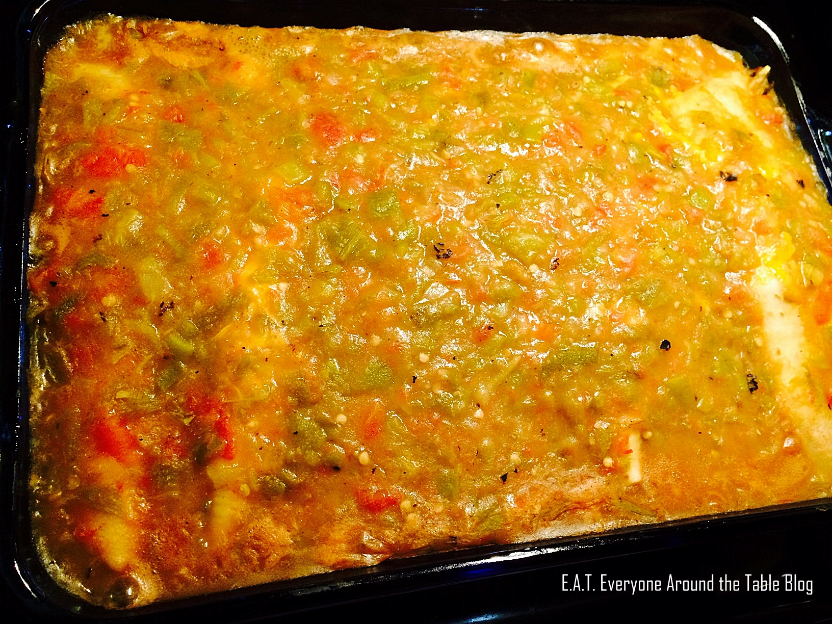 5. Pour the green chile over the top making sure every bit of tortilla is covered so that it all stays moist. Then sprinkle cheese over the top, evenly.